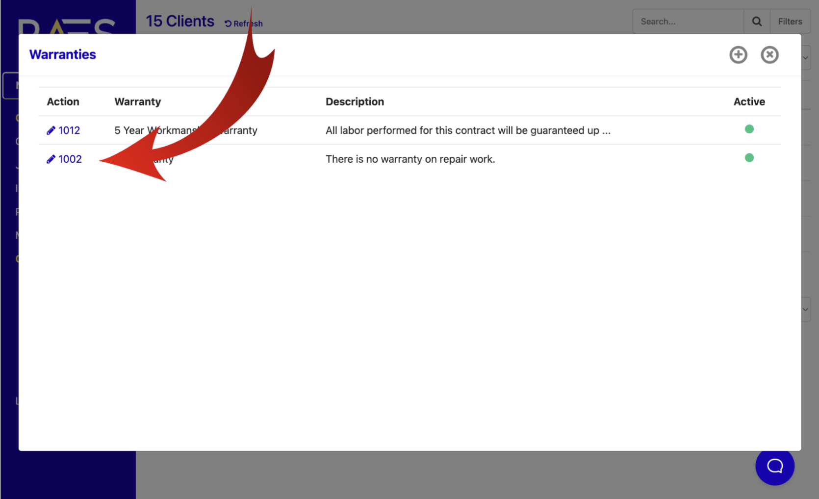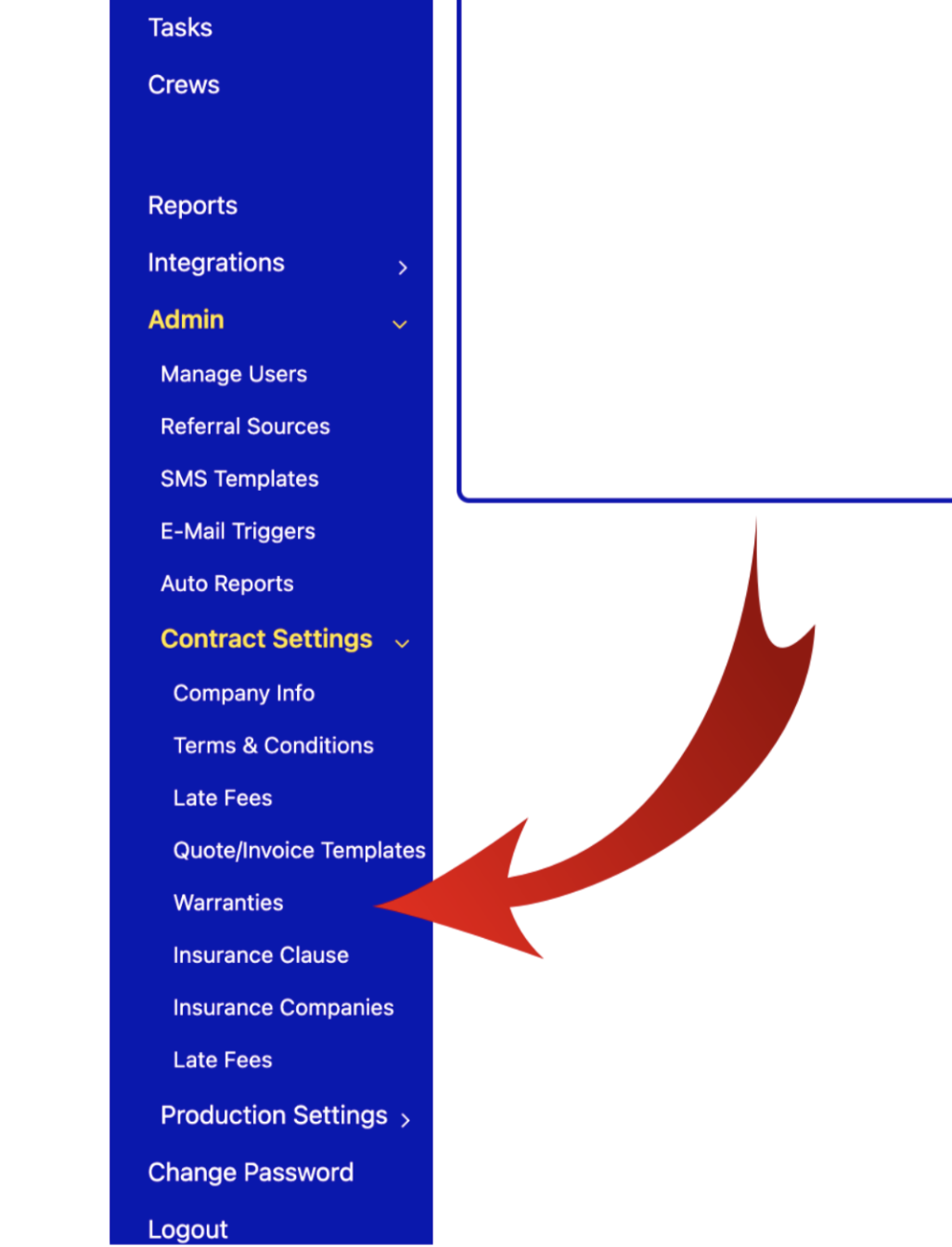 On the menu on the left side of the main page go to Admin > Contract Settings. Click on Warranties and choose the next action that you want to perform.