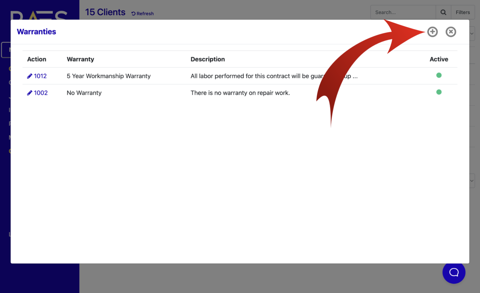 To Add the warranty options on the Quote (Draft), click on the '+' Key in the top right portion of the window then input the necessary information. To add the new warranty term, click Submit.