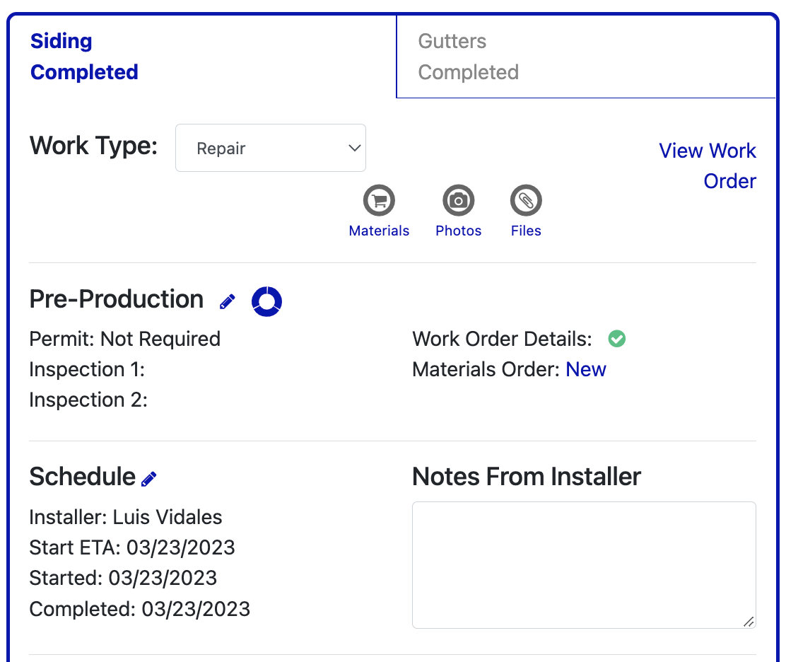 Select Installer: The dropdown menu will display all of the crews (in-house or subcontractors) that you have set up in your system. Selecting an installer will move the Work Order to status Assigned. Upon saving your selection, the work order will be delivered to the selected Installer.
