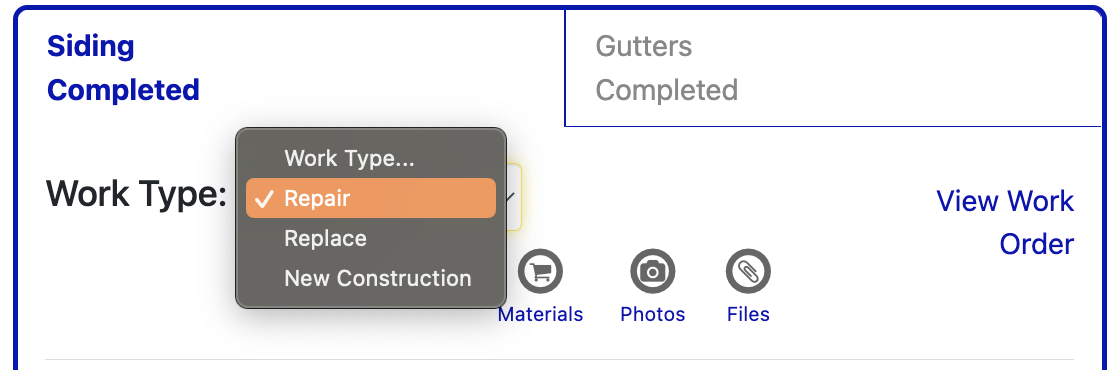 There are 3 work types to choose from; Repair, Replace, and New Construction. You can only manage the pre-production requirements after selecting the Work Type of the job since the format of the information needed in the work order details window will vary depending on the selected work type.