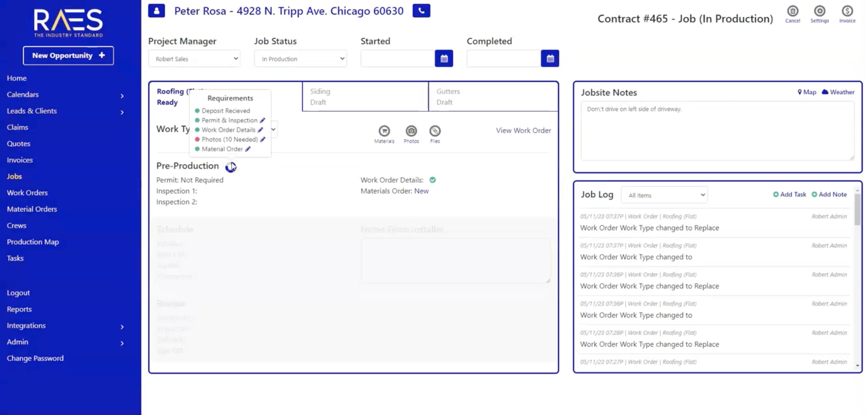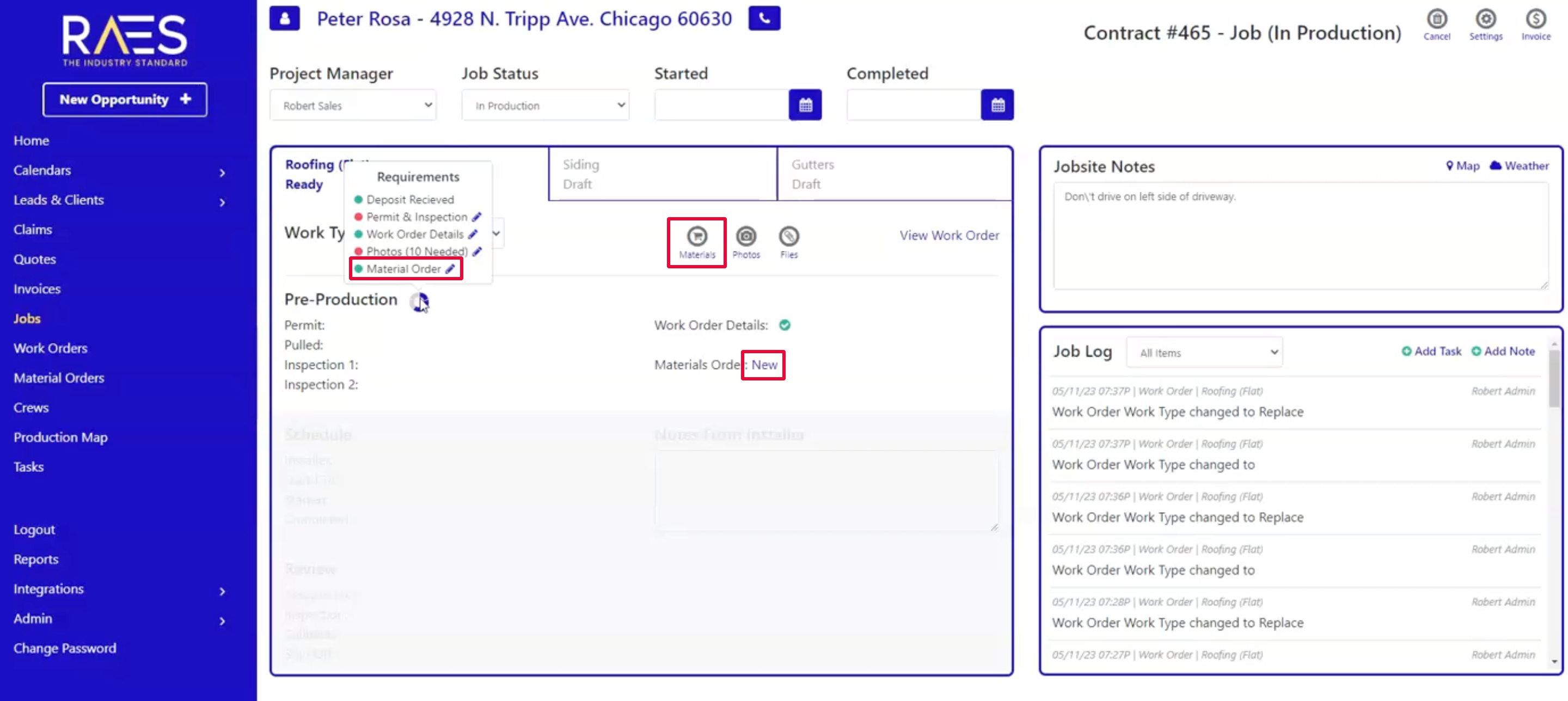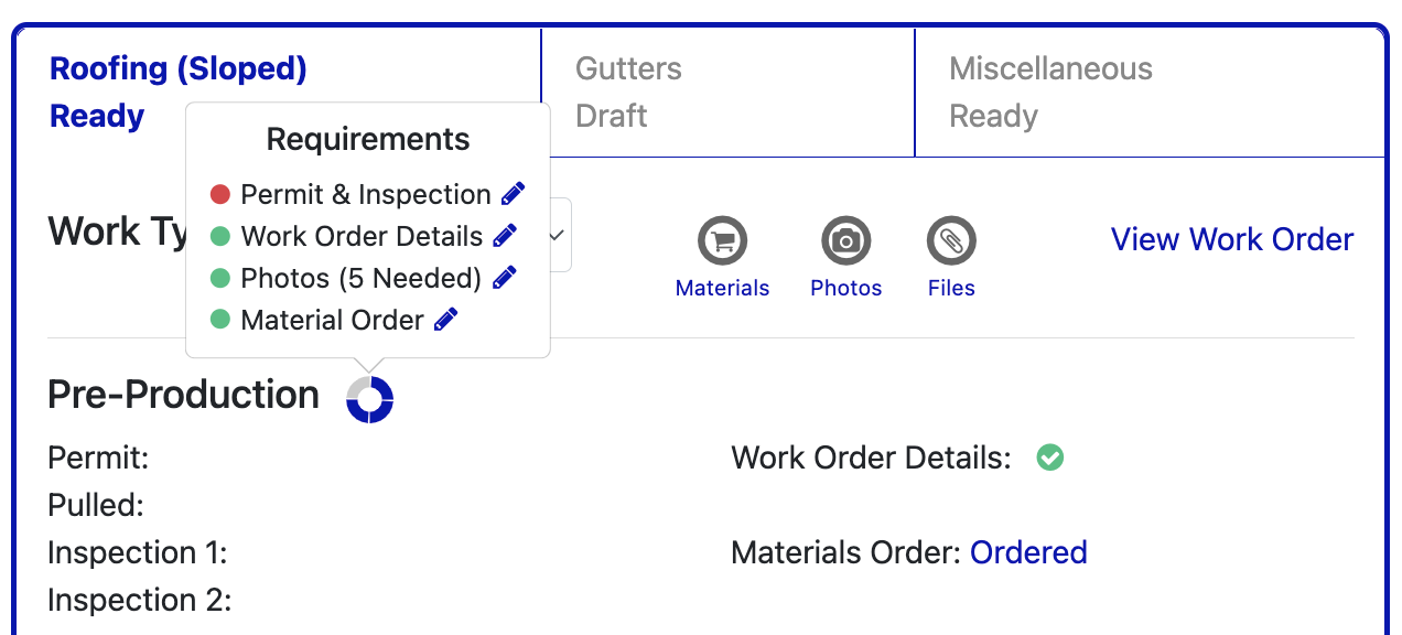 It provides you with a list of all the necessary requirements for each job or service. This includes everything from permits, work order details, photos, and materials. You can easily access and work on the specific requirement by simply clicking on the pencil icon. Shortcut icons are also provided for quick access to the most commonly used tools during the pre-production stage. These include material orders, photo attachments, and file attachments. You can easily find and access these tools from the requirements page, allowing them to complete tasks quickly and easily.